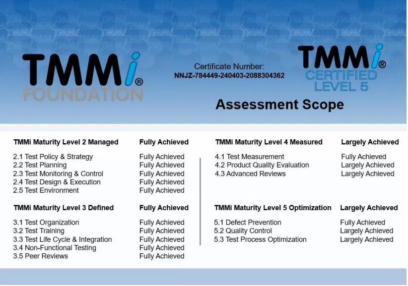 在本次TMMi5级认证过程中,神州信息咨询认证团队依据TMMi基金会推荐使用的IDEAL模型,进行了差距分析、体系优化建模、项目试点、预评估与正式评估等一系列改进和认证评估工作。TMMi咨询评估团队经过客观、认真细致而全面的评估,一致确认三亿体育融信在TMMi高成熟度方面表现出业界专业水平,完全符合TMMi5级的16个过程域标准。